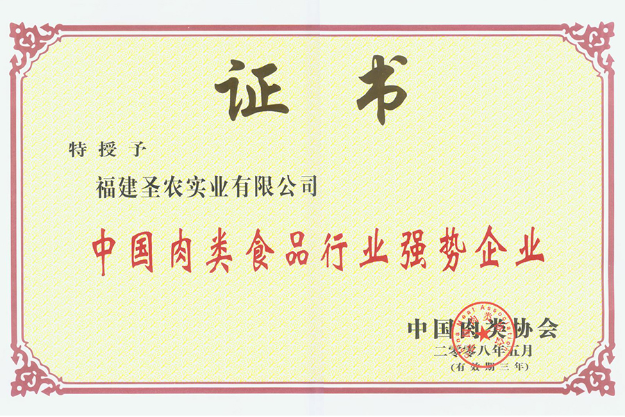• 2008年肉类食品行业强势企业证书