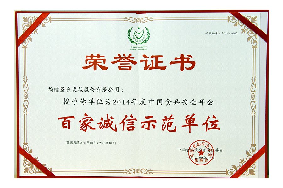 • 2014年百家诚信示范单位证书