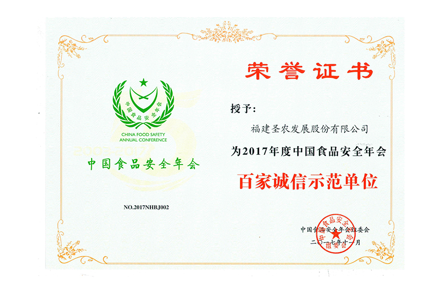 • 2017年中国食品安全年会 百家诚信示范单位.证书