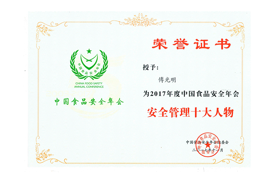 • 2017年(傅光明)中国食品安全年会 安全管理十大人物.证书