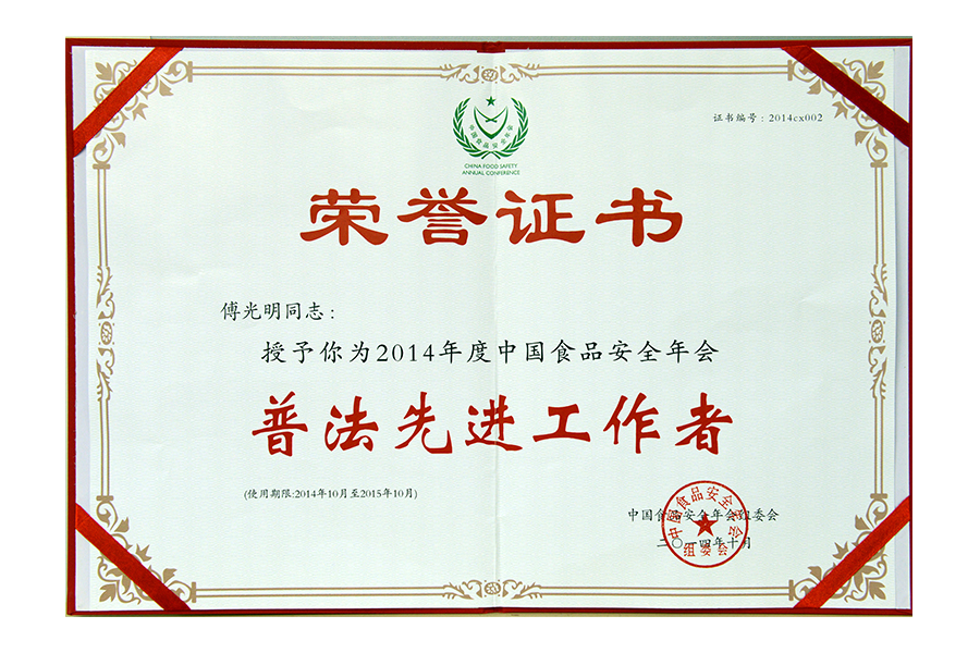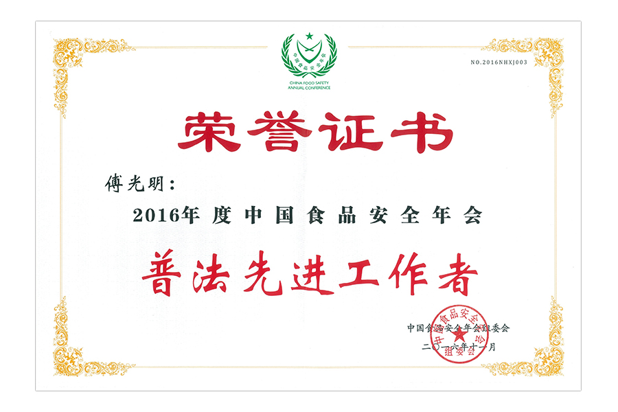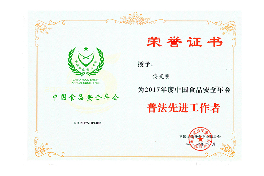 • 2017年(傅光明)中国食品安全年会.普法先进工作者.北京.证书