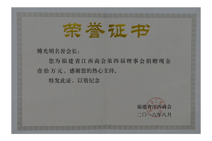 • 2016年(傅光明)江西商会捐赠10万元证书